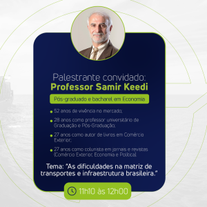 O evento trará palestras e muitos conteúdos agregadores sobre o setor de Comércio Exterior, no Teatro Adelaide Konder e suas dependências anexas. Além disso, trazemos o renomado Professor Samir Keedi como palestrante, abordando o tema “As dificuldades na matriz de transportes e infraestrutura brasileira”, às 11h10!
